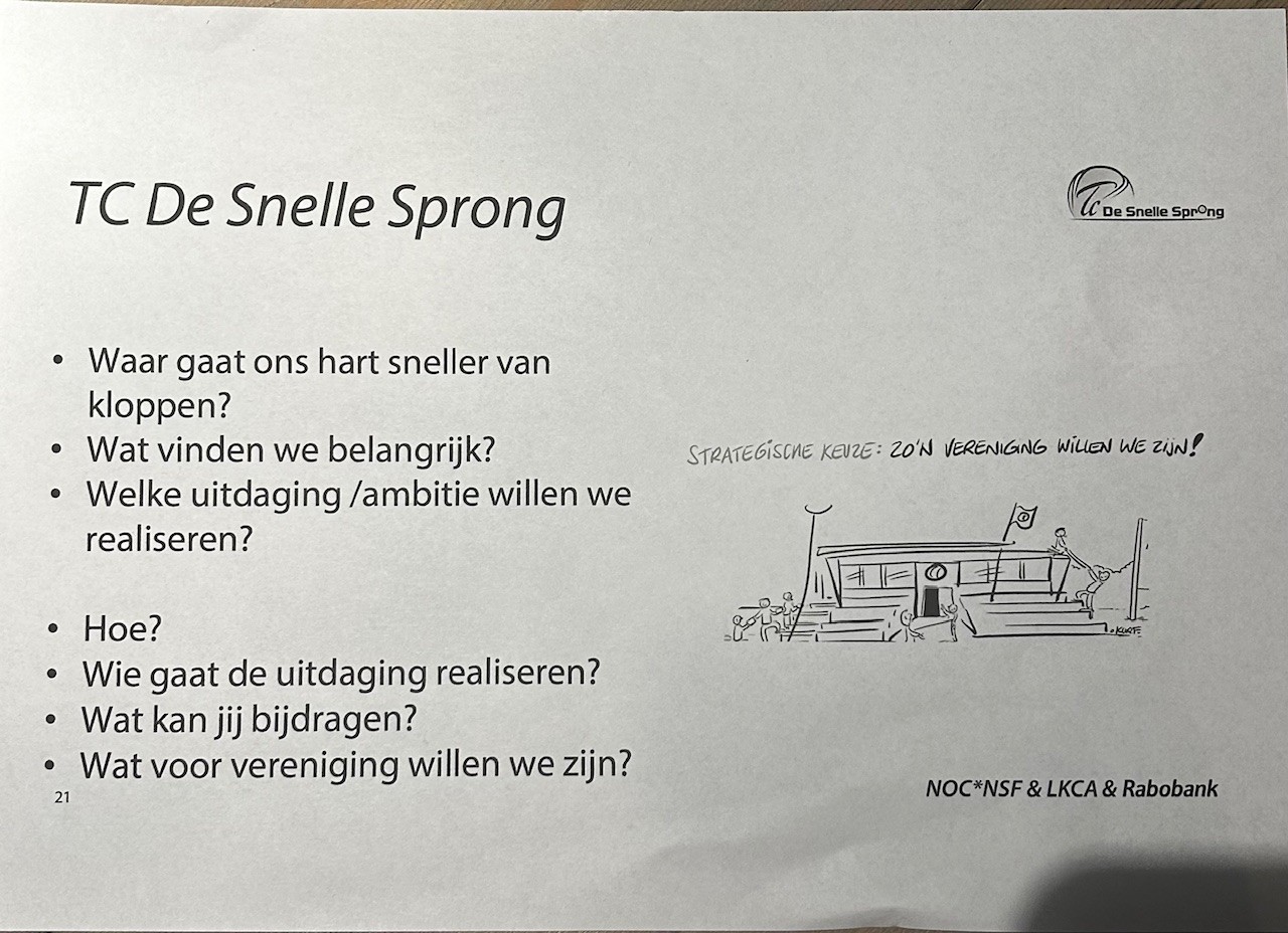 Ontwikkelingen in het KNLTB Tennis, kansen voor onze vereniging en wat wij als leden belangrijk vinden, kwam allemaal aan bod. Er werd massaal meegedacht en samengewerkt om ideeën op papier te zetten met verassende inzichten en resultaten.